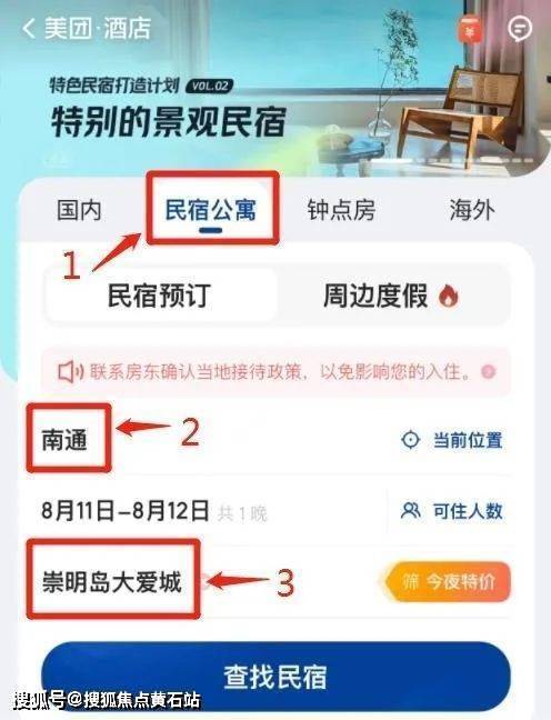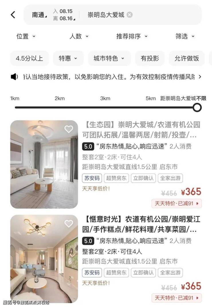 “崇明岛·大爱城民宿的预订方式也很简单,点击“美团—酒店/民宿—民宿公寓”,位置选择“南通市”再搜索关键词“崇明岛·大爱城”就可以了(详见下图)。这里不仅有海派风情商业街和风景C位的湖心岛餐厅,交通出行也还算方便,而且崇明岛·大爱城里的民宿房屋都很新,装修精致,体验到位。”