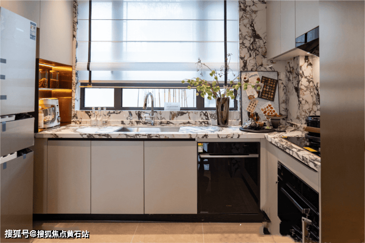 五个院子的别墅售楼处电话:400-870-6009 厨房U型操作台面,操作便捷,并预留了双开门冰箱位置。