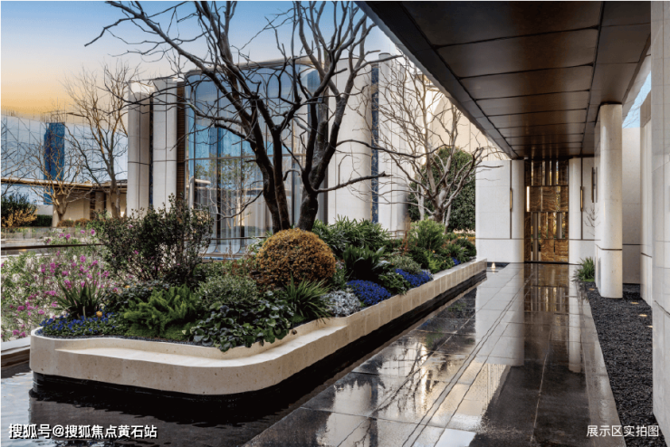 考究《周礼·考工记》古代规格定制“面阔九间”归家门庭,门庭外立面采用雅奢温润的建筑材料,辅以两侧具有仪式感的跳泉水景,共同构成了“贵雅清和”的城市界面。