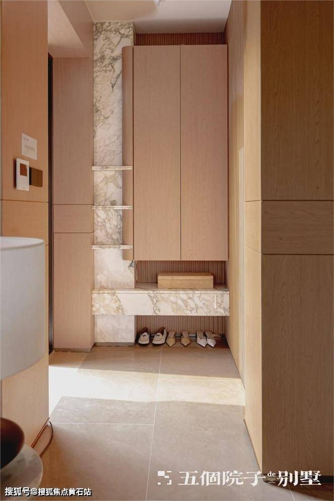 进入玄关,超大空间入户玄关,可以在保证了业主私密性的同时定制一排柜子,更好增加室内的储物。