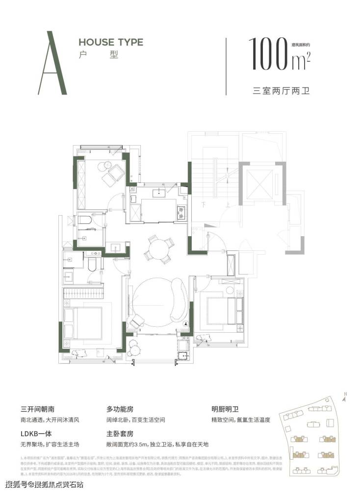 建面约 100㎡ 3 房 2 厅 2 卫:内中环 900 万内绝版三房,全朝南飞机户型,空间利用率拉满,刚需上车首选;