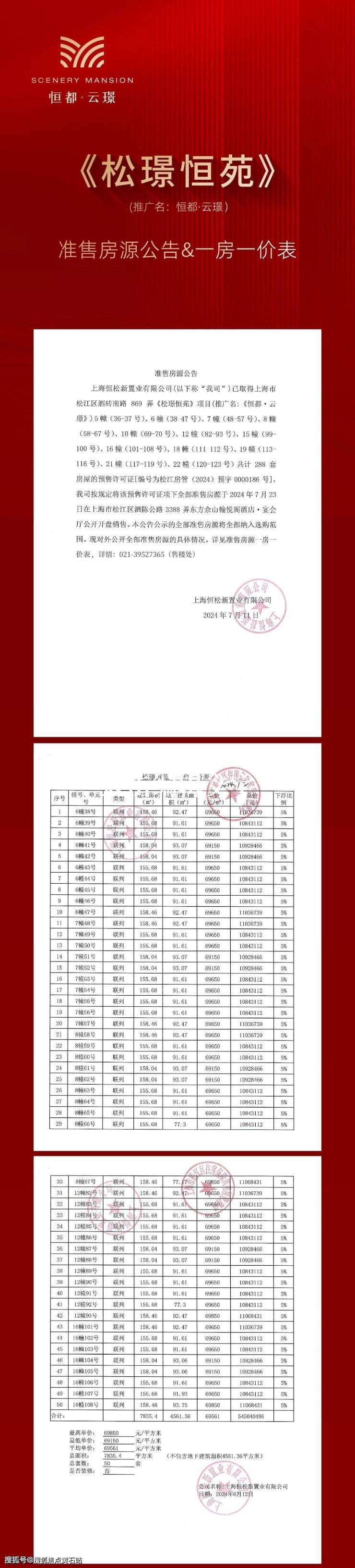 松璟恒苑小区于2024年7月11日取得288套房屋的预售许可证「编号为松江管(2024)预字0000186号」,松璟恒苑(推广名:“恒都云璟”)本次取得预售证的房源于2024年7月23日在上海松江区泗陈公路3388弄东方佘山翰悦阁酒店·宴会厅公开开盘销售。