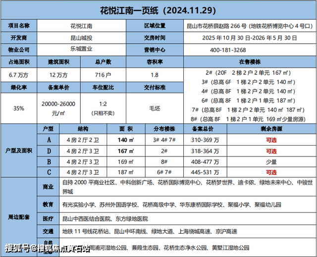 作为花桥的地标性建筑,花悦江南在规划与设计上更是下足了功夫。项目总占地面积约6.7万平方米,建筑面积约12万平方米,精心规划了716户尊贵居所,其中包括15栋6-8层的多层洋房和4栋20-26层的高层住宅,错落有致地布局在这片绿意盎然之中。户型设计上,花悦江南提供了约140㎡、167㎡、169㎡、187㎡等多种面积段的选择,每一种户型都充分考虑到了现代家庭对于居住空间的需求与追求,无论是三口之家还是三代同堂,都能在这里找到最适合自己的温馨港湾。