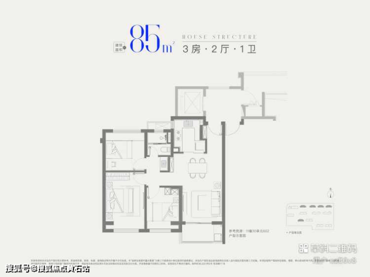 ● 85㎡三房一卫(二/三期):总价320万起,两梯四户(有连廊),户型方正全明,南北通透,三开间朝南+短进深,采光通风俱佳,适配新婚家庭或三口之家。