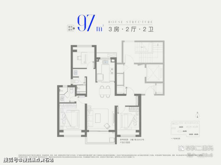 ● 97㎡三房两卫(三期):总价405万起,一梯两户(无连廊),南北通透,三开间朝南+观景阳台,主卧套房设计,满足改善型家庭品质生活需求。
