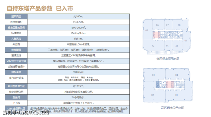东塔建筑面积约4.6万方,单层约1800-2600平,分割销售和出租,单套面积约170-500平,层高4.5米