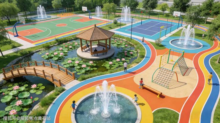 多个景观及运动场地,木桥荷花池,休闲凉亭,多个水景喷泉, 篮球场,羽毛球场,七彩塑胶跑道,以及适合小朋友玩的勇敢者道路,让公园更有参与性,适合全年龄段在园区内进行户外运动。