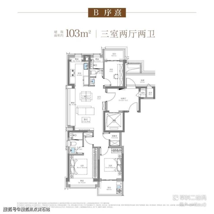 - **100-103㎡ 三房两厅两卫**:南向双阳台,餐客一体式布局,尺度从容,满足新生代家庭或品质刚改的全面需求。