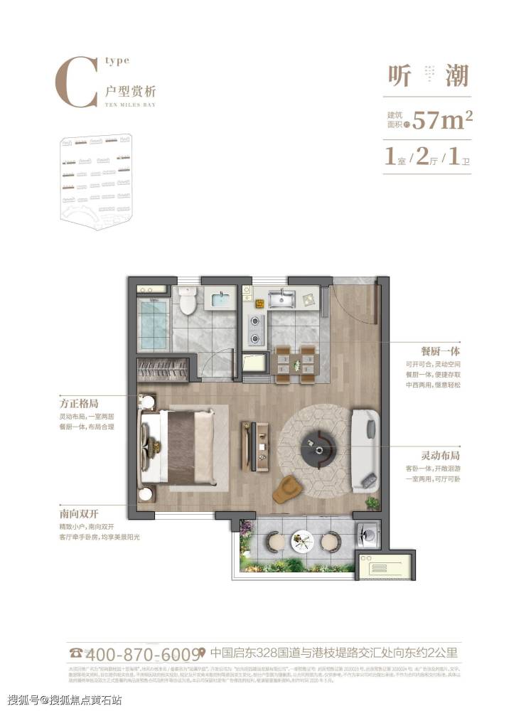 在售户型:57平一房,77平两房,100平三房,106平复式