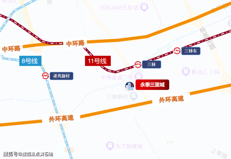 项目地处浦东三林核心,坐享 **“前滩、张江、陆家嘴”黄金三角** 辐射红利。作为 **“金色中环发展带”** 关键节点,共享前滩国际商务区顶级配套,却以约 **8万+** 的单价,坐拥肉眼可见的 **“价差红利”**,是资产跃升的难得窗口。