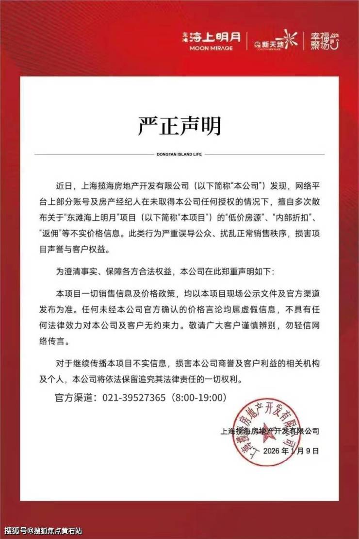 今日,上海揽海房地产开发有限公司(以下简称“本公司”)发现,网络平台上部分账号及房地产经纪人在未取得本公司任何授权的情况下,擅自多次散布关于“东滩海上明月”项目(以下简称“本项目”)的“低价房源”、“内部折扣”、“返佣”等不实价格信息。此类行为严重误导公众、扰乱正常销售秩序,损害项目声誉与客户权益。