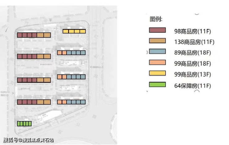 根据项目规划设计方案公示,拟建4栋11F小高层住宅、1栋13F高层住宅、3栋18F高层住宅、1栋保障房以及配套用房,总建筑面积约为10.35万平方米,其中住宅部分计容面积约为6.47万平方米,保障房计容面积约为0.32万平方米,其他配套设施计容面积约为0.21万平方米。